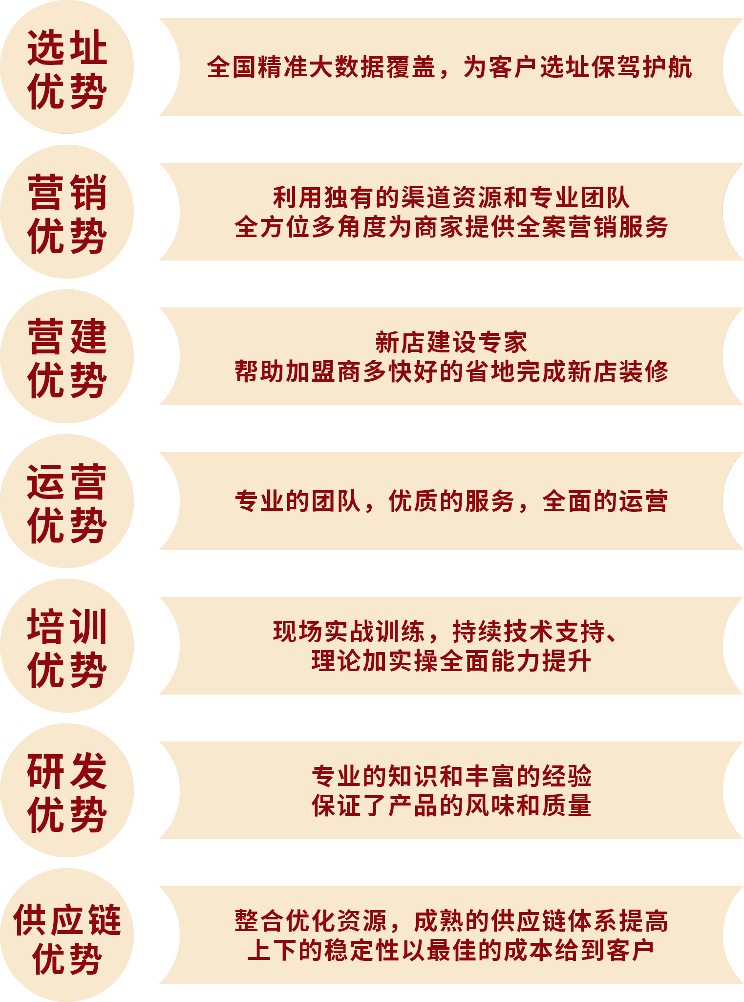 极少油烟、操作简单。好吃不腻、成瘾性强。 市井搭配、出境率高。高翻台率、高利润额。 顾客群体广泛、男女老少皆宜! 品质快餐+特色夜宵的双赛结合。 地方美食名片,品类自带流量。
